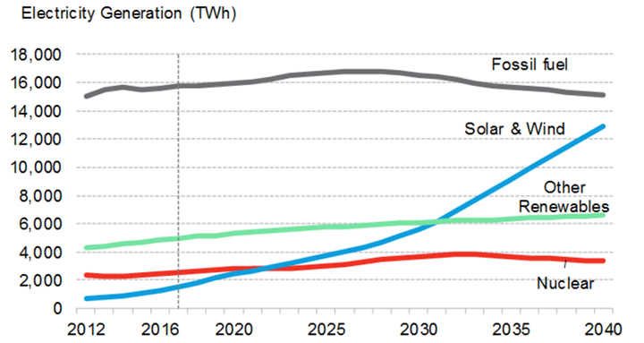 In the U.S., the Trump administration has voiced support for the coal sector. However, NEO 2017 indicates that the economic realities over the next two decades will not favor U.S. coal-fired power, which is forecast to see a 51% reduction in generation by 2040. In its place, gas-fired electricity will rise 22%, and renewables 169%.